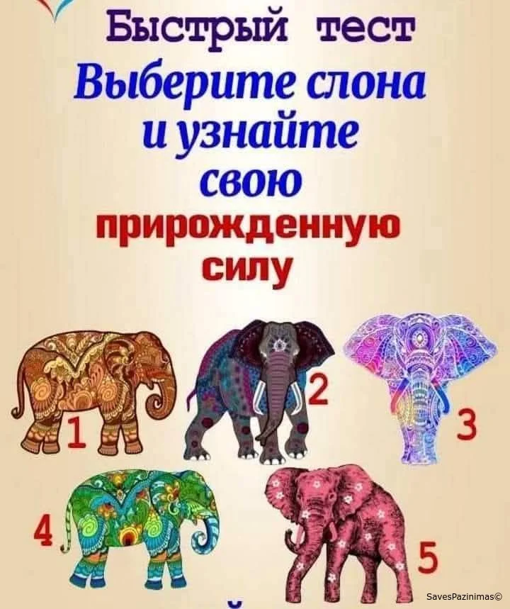 Взгляните на картинку. Выберите олицетворение силы — слона, который Вам понравился больше остальных предложенных. Прочитайте, что означает Ваш выбор.